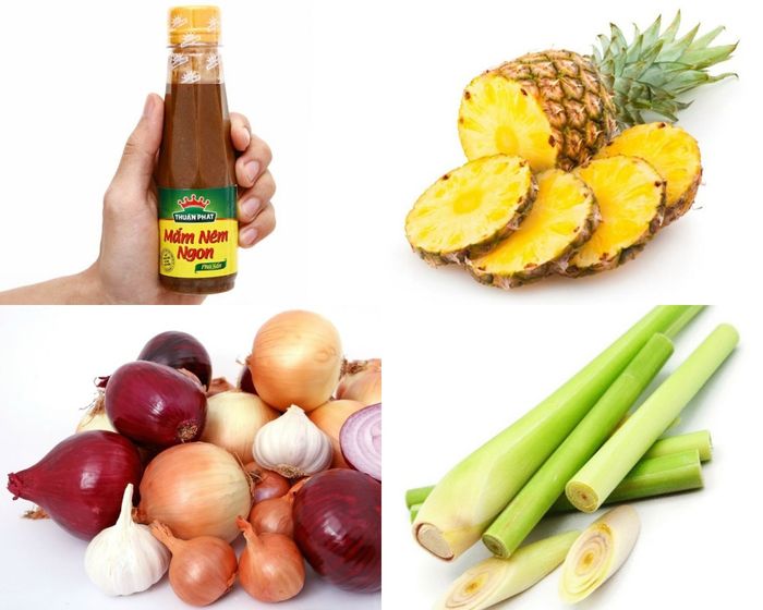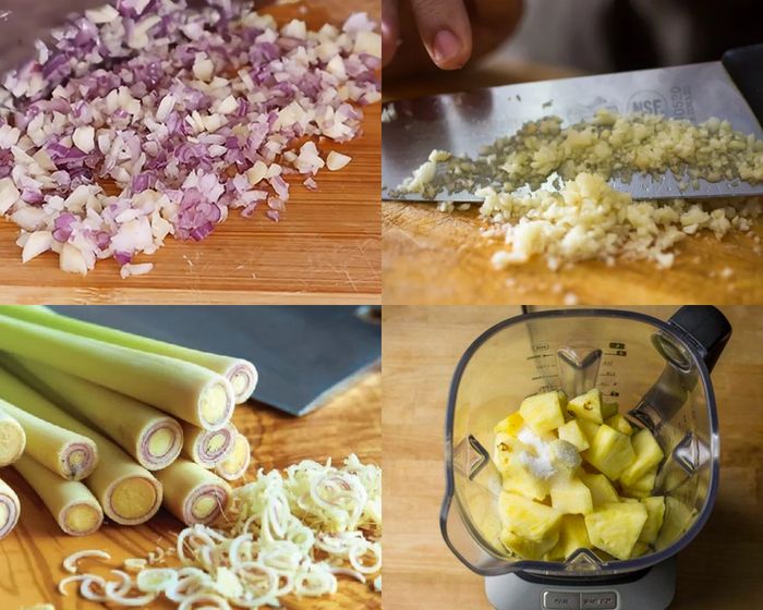 Step 1: Peel and clean garlic, shallots then mince. Wash and mince chili, lemongrass. Cut pineapple into small pieces and put into a blender to puree. Before blending, add 100ml of distilled water.