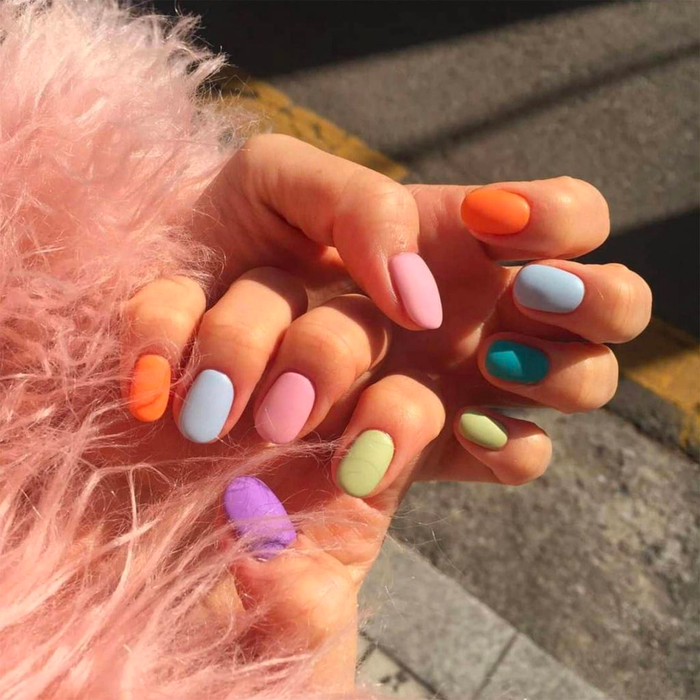 Round nails can be paired with many nail polish colors, from neutral, pastel, peach, elegant pink to hot and bold shades. However, you should consider that round nail shape is often weaker and more prone to breakage than other nail shapes. Therefore, before painting or drawing, you should use nail moisturizer to help strengthen your nails.