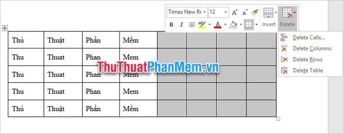 Step 2: Right-click on the area you just selected. The quick selection menu appears, click on the Delete icon on the outermost side.