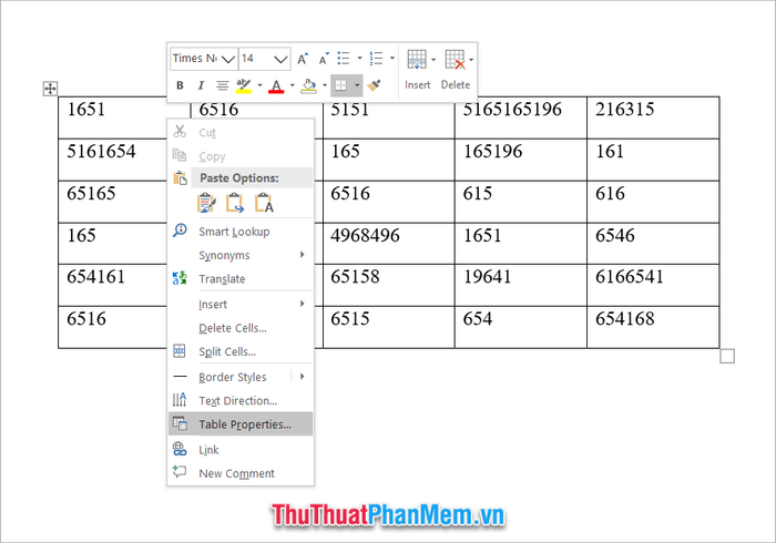 Then select Table Properties from the displayed options list.