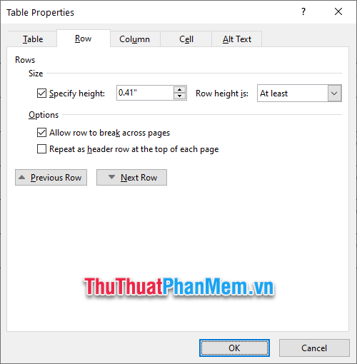 In the displayed Table Properties window, switch to the Row tab to adjust row width in Word.