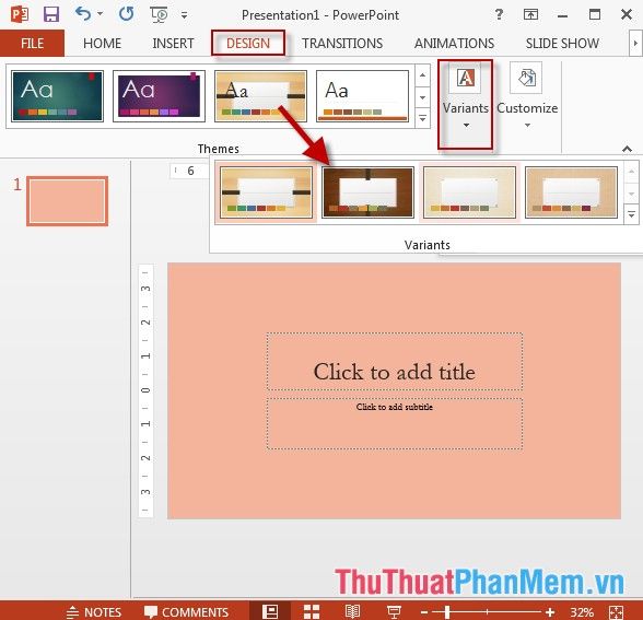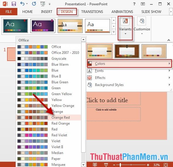 Step 2: If you want to choose different color schemes, click the arrow -> Colors -> a list of coordinated colors will be displayed -> choose a color suitable for your slide: