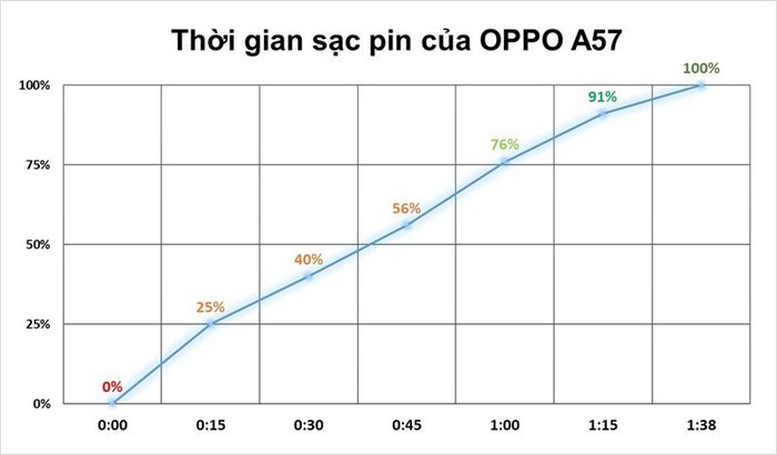 Results of the battery charging time test on OPPO A57.According to the results, OPPO A57 can fully charge from 0 to 100% in just 1 hour and 38 minutes. This is a quite impressive figure, and personally, I consider it a significant advantage compared to other products in the same price range. Achieving this result is largely due to the 33W fast charging that the company has equipped for OPPO A57. It can be seen that the charging speed of the device is significantly shortened compared to other competitors in the same segment. This is also the feature that I think is the most value-for-money on OPPO A57!