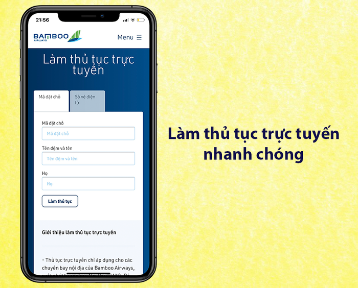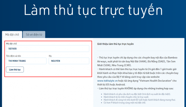 Currently, Bamboo Airways has implemented online check-in for 06 airports including Noi Bai (HAN), Tan Son Nhat (SGN), Da Nang (DAD), Nha Trang (CXR), Con Dao (VCS), Phu Quoc (PQC).