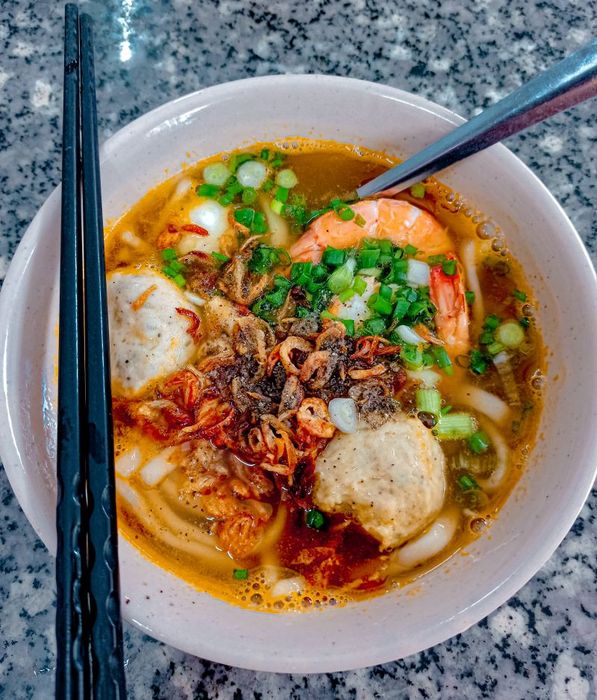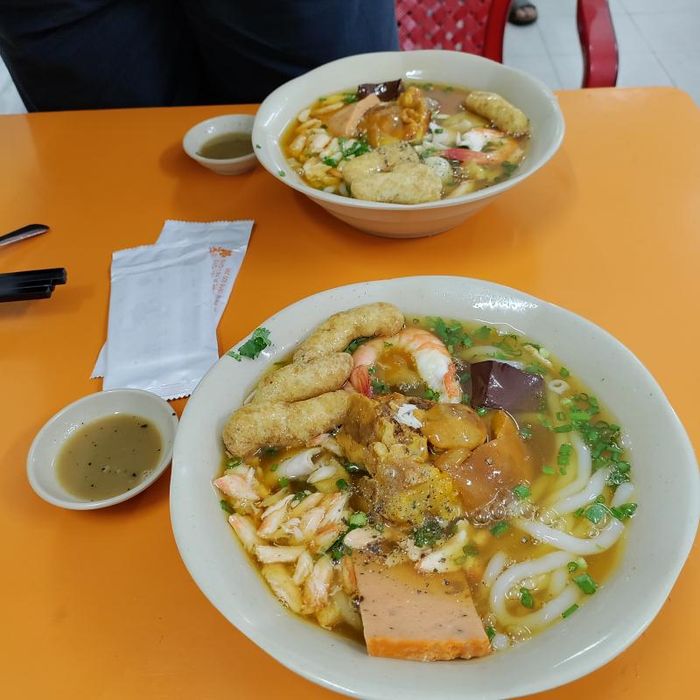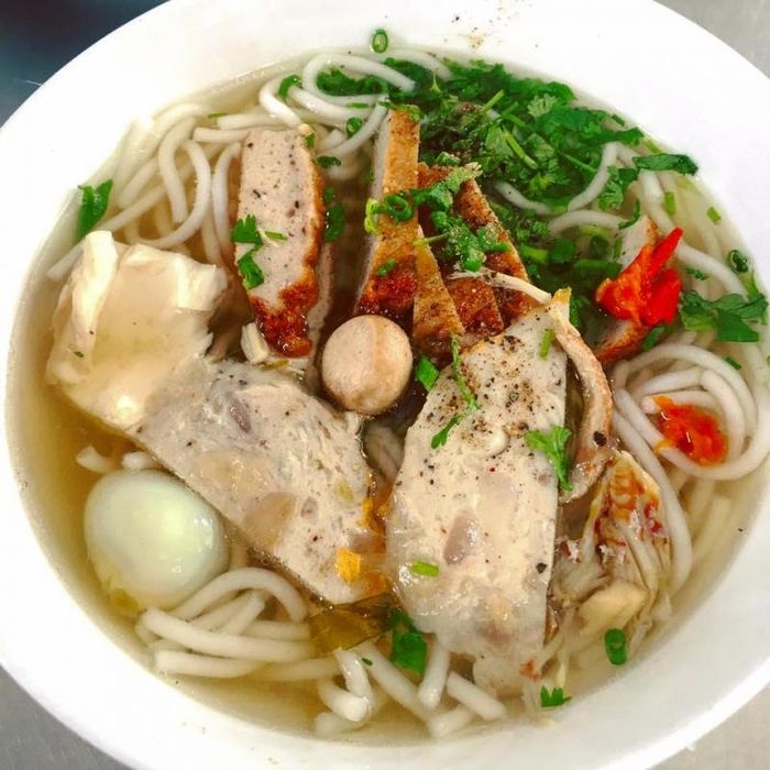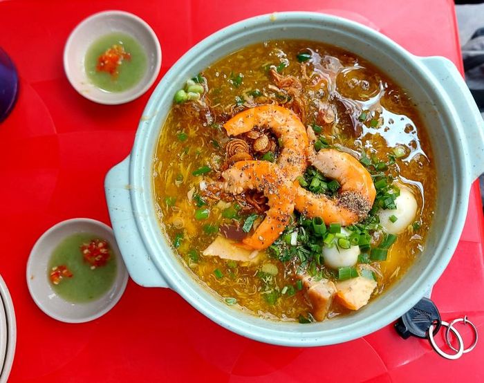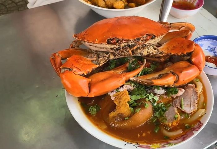 Mrs. Ba's Crab Soup Cake stall is located in an alley about 20m inside, always crowded with customers. The super-sized crab soup cake pot can satisfy 2-3 people. The broth and the toppings are very delicious and fresh. The best part is the soup cake itself, which is not mushy, with thick strands and flavorful broth. At Mrs. Ba's crab soup cake stall, you can enjoy a hearty bowl filled with fish cakes, pork trotters, blood cakes, quail eggs, and fresh shrimp. For the pot-style soup cake, the food is kept warm longer in the ice pot, delivering a fragrant and unforgettable taste. Additionally, the dipping sauce with green chili salt is one of the wonderful flavors that Mrs. Ba's stall brings to customers. The fragrant and delicious crab soup cake, combined with the sweet and clear broth, the firm and chewy crab meat, and the soft, non-sticky soup cake strands, will surely satisfy you.