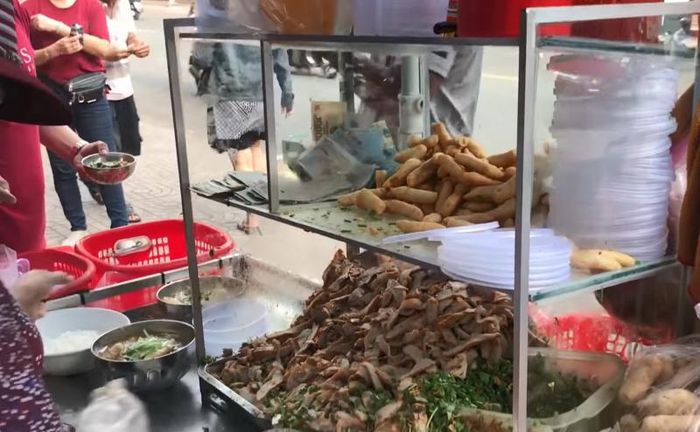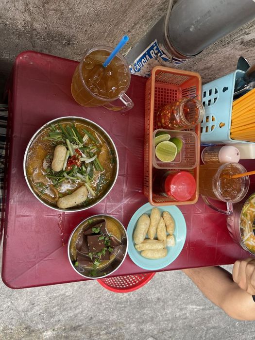 The toppings include 2 large fresh shrimp and 2 sizable pieces of pork sausage. The shrimp are already peeled, fresh, and sweet, and the sausage is quite big and flavorful, soaking up the seasoning well. The blood jelly here is delicious, without any fishy or off-putting smell. It also comes with a plate of fried dough sticks, which is just perfect. Additionally, the spot sells bone marrow porridge, beef balls, pig brain, and more. The average price for a bowl is only 35,000 VND. Soup cake enthusiasts, don't miss out on this address!