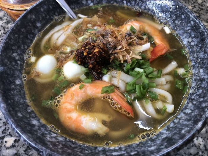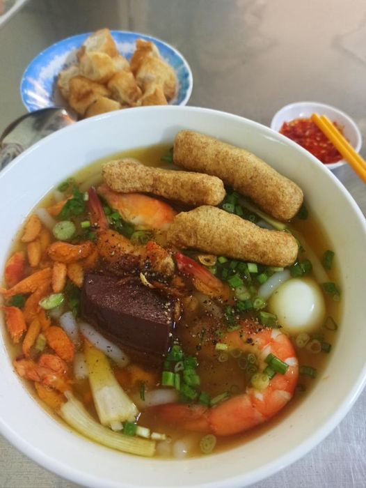 Regarding the ambiance, this place is located on Le Hong Phong Street, with a sign hanging outside indicating it's the rice flour shrimp soup cake spot, so it's easy to find. There are tables both outside and inside the establishment. There's free parking available on the side and no fees charged. It's cool outside and bright and clean inside. The rice flour noodles are made from rice flour, not the slippery industrial kind, so they're less likely to cause satiety. They're delicious, not too chewy, and absorb the broth well. The broth at Rice Flour Shrimp Soup Cake - Le Hong Phong is made from turnips, so it has a sweet and clear taste, rich and naturally flavorful. If you like it spicy, add a bit of chili for an extra kick.