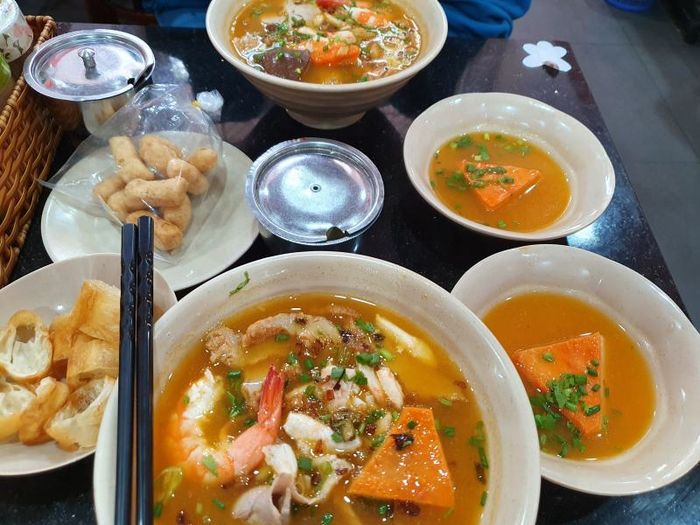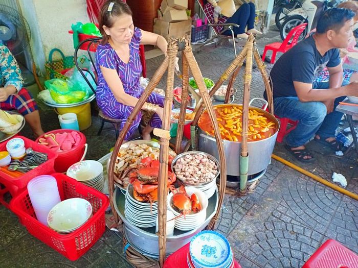 Mrs. Tu's Crab Soup Cake is a place known for its famous soup cake dish that excites many diners. Here, soup cake is sold at various prices depending on the customer's request. Simply with a cart of eye-catching orange broth and a variety of toppings, this address is quite easy to find because of its prominent crowdedness. The small soup cake cart in Hoa Binh Market, District 5, is known not only for its taste but also for its very 'rich' prices.