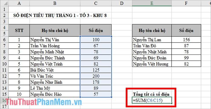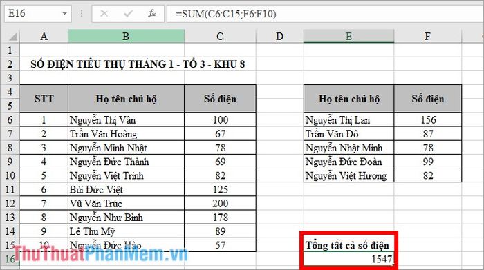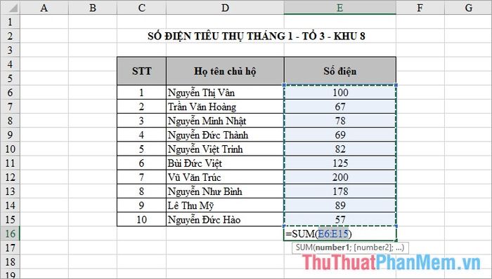 The SUM function can calculate the sum of cells in a column, a row, or multiple columns, multiple rows, or a large range, various data ranges on an Excel spreadsheet.