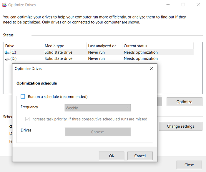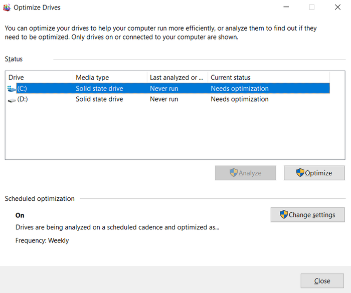 Currently, Microsoft is testing a patch and releasing it to Insider users. However, there's a way to disable the automatic defragmentation feature in the Defragmentation and Optimize Drives tool. Open the tool, select the SSD drive > Change settings > uncheck Run on schedule > OK.Source: TechSpot