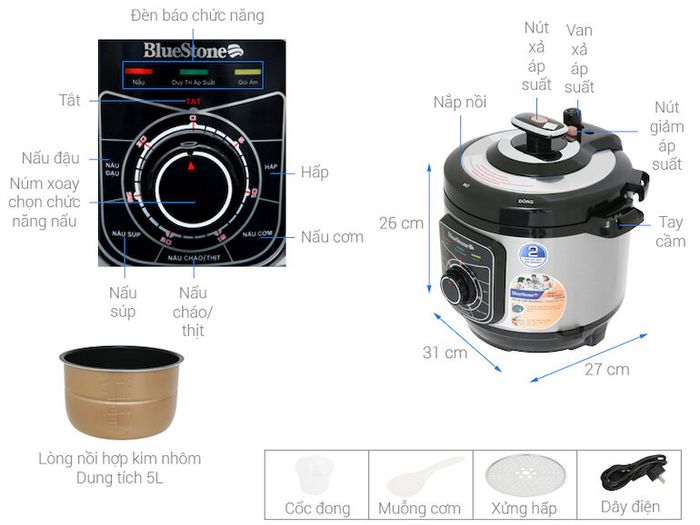 The polished stainless steel exterior of the BlueStone PCB-5619 exudes elegance and resists deformation under heavy force. With a 5-liter capacity, it meets the cooking needs for families of 5-6 people. The 1.8mm thick inner pot, made of high-quality aluminum alloy with a non-stick coating, ensures safe and toxin-free cooking, minimizes sticking and burning, and is easy to clean.