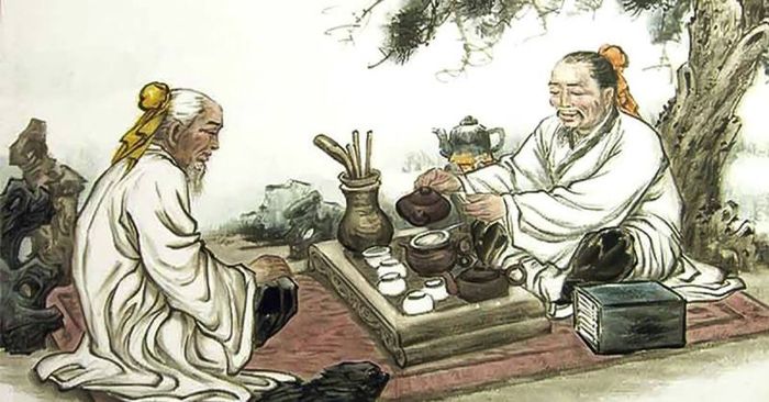 With specialized tea, seven cups in a row, with Kieu lifting a pair of lines;