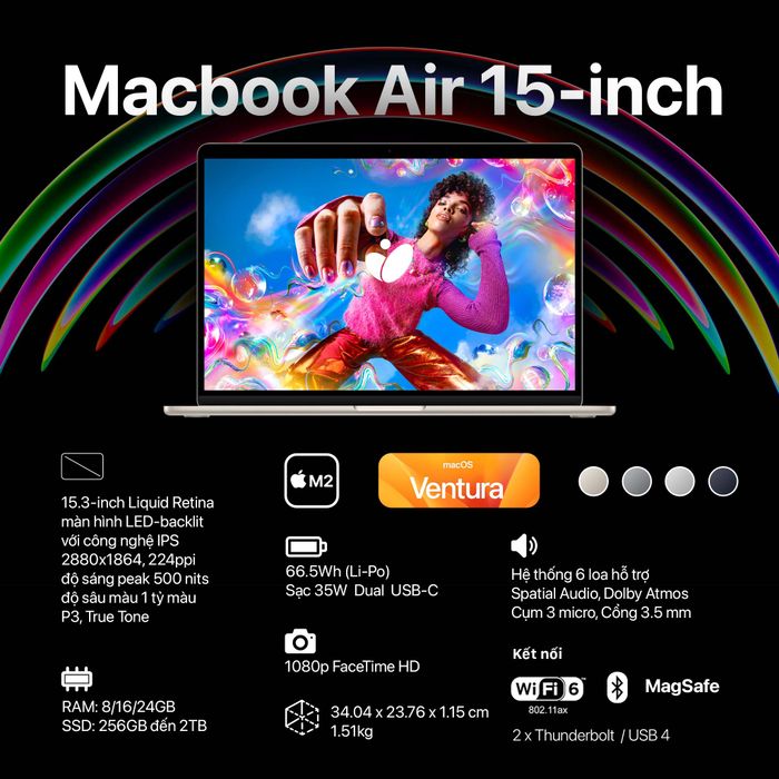 All MacBook Air 15' M2 models start with a high-end configuration similar to the MacBook Air 13' M2. In more detail, the M2 chip in the 15' version houses a 10-core GPU and comes with a standard 35W charger with two USB-C ports or a 70W charger with a single port.If you opt for the base configuration of the MacBook Air 13' M2, the chip only has an 8-core GPU, comes with a 30W charger, and additional configuration options cost an extra 500,000 VND for either a 35W or 70W charger.Finally, the MacBook Air 15' M2 boasts a total of 6 speakers, surpassing the 2 speakers on the MacBook Air 13' M2. This promises a superior audio experience for the 15' version.