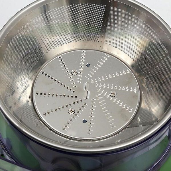 The operating principle of the machine is that when you feed the fruit in, the grinding wheel will operate at a very high speed (almost 2,400 revolutions per minute), quickly grinding the fruit into pulp and separating the juice from the pulp through centrifugal force.