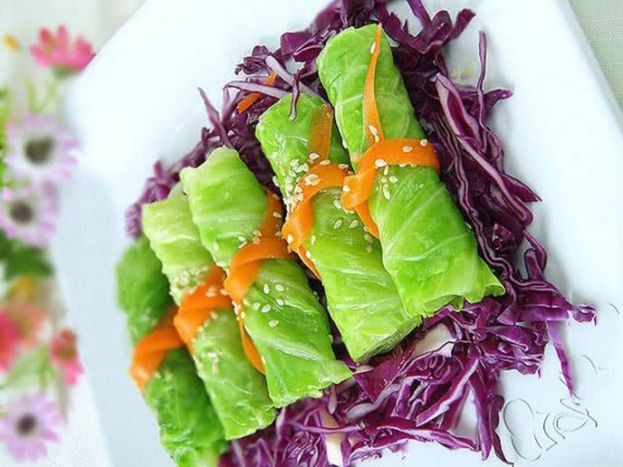 - Cut each cabbage leaf into halves, stack two halves together and roll tightly. Repeat until finished. Use carrot strips to tie the cabbage rolls to prevent them from coming loose.