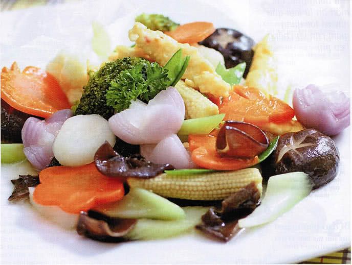 Saute onions until fragrant, add cabbage, stir-fry, add tofu, baby corn, carrots, straw mushrooms, continue stir-frying until vegetables are nearly cooked, season with seasoning powder to taste.