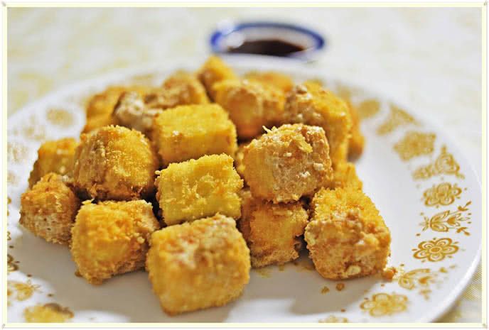 Cut tofu into slices, heat oil in a pan, fry at around 800 degrees until golden brown.