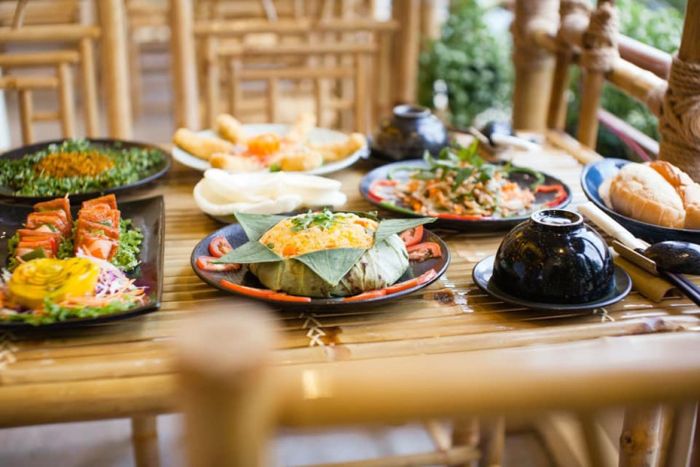 If you want to cast aside worries, set aside the hustle and bustle of life, and temporarily leave the noisy city, then come to Sen Meditation House in Nha Trang, in Vinh Thai ward. The space of the restaurant features old French architecture with simple yet harmonious decorations with nature such as lotus ponds, banana trees, coconut trees, and old objects that take us back to childhood. Here, the restaurant will serve you delicious, purely vegetarian dishes to make our souls become more serene.