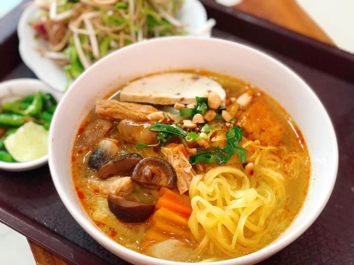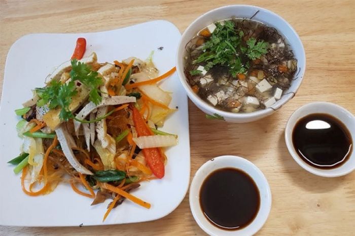 Cô Ba Mỹ Lại Vegetarian Eatery is renowned for its variety of vegetarian noodles, pho, noodles, spring rolls, fried tofu vermicelli, and Hue-style vermicelli. With its unique cooking style, the dishes at Cô Ba Mỹ Lại always attract many diners to come and enjoy. Noodles, vermicelli, or pho are always accompanied by distinctive toppings such as mushrooms, tofu, fried tofu, shiitake mushrooms, ingredients that make the dishes delicious and high-quality. Don't forget to order a delicious soy milk as well.