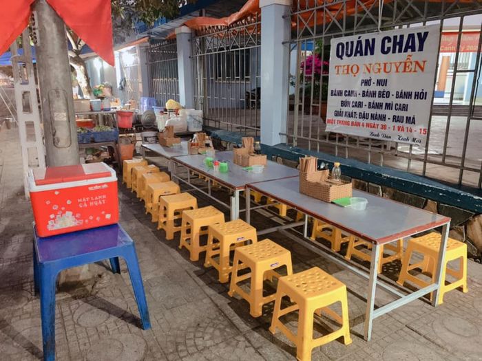 Tho Nguyen Vegetarian Restaurant is located on the sidewalk at 58 Yersin Street. Although the restaurant only opens for 4 days a month, it is always crowded. The menu includes pho, noodles, rice cakes, water fern cakes, steamed rice noodle rolls, curry noodles, curry bread, all delicious, especially the tasty vegetarian rice cakes and curry noodles. The restaurant is clean and tidy, and you can also order a glass of pennywort or soy milk to refresh yourself.