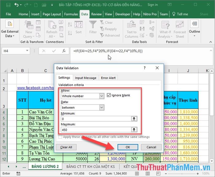 Step 2: A dialog box appears in the Allow section, choose Whole number -> in the Data section, select Between -> enter the corresponding value limits for Minimum and Maximum.