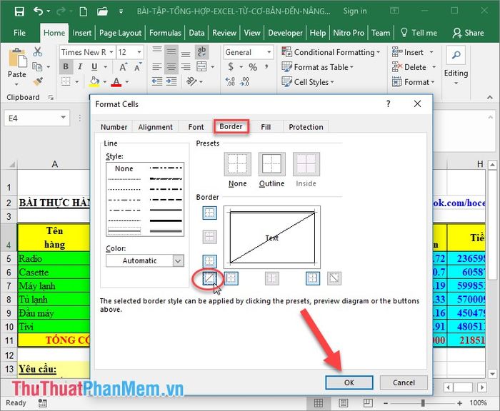 2. Select the data cell for the diagonal line -> right-click and choose Format Cell, then select the cell containing the diagonal line in your preferred direction.