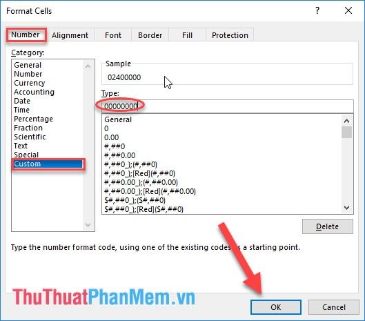 2. Format the data cell, under the Type section, enter 8 zeros: