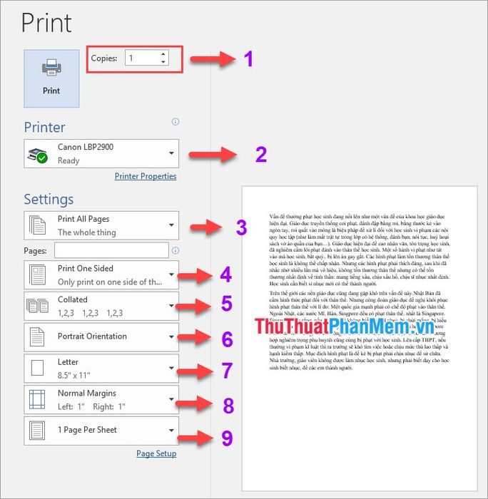 After checking the above information, proceed to print the Word document as follows: