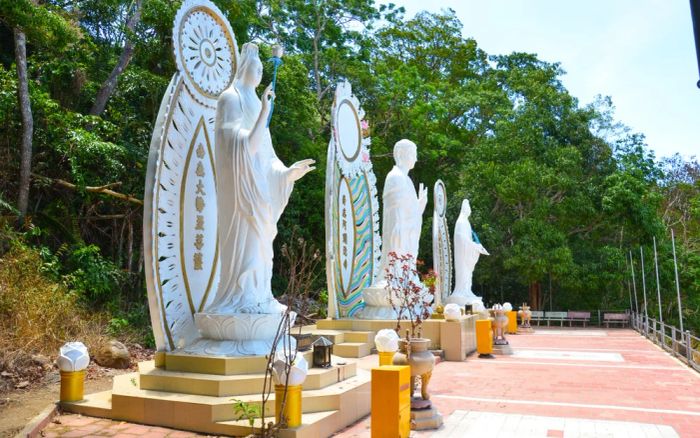 Located on the peak of the 420m high mountain, Linh Son Truong Tho Pagoda sits halfway up the mountain, exuding majestic and unique beauty. Stepping into the pagoda, visitors will feel like entering a spiritual world, peaceful with Buddha statues, ancestral altars, stupas, and the Thất Bảo pond. The pagoda is also home to the largest statue of Buddha in Vietnam, measuring 49m in length and 11m in height. Amidst the solemn statue, surrounded by the sound of wind, flowing water, and the faint silhouette of Hon Ba Island in the distance, you will find moments of tranquility and relaxation for the soul.