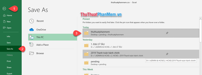 Step 4: Select File (1) => Save as (2) => Choose the folder where you want to save the Excel file (3).
