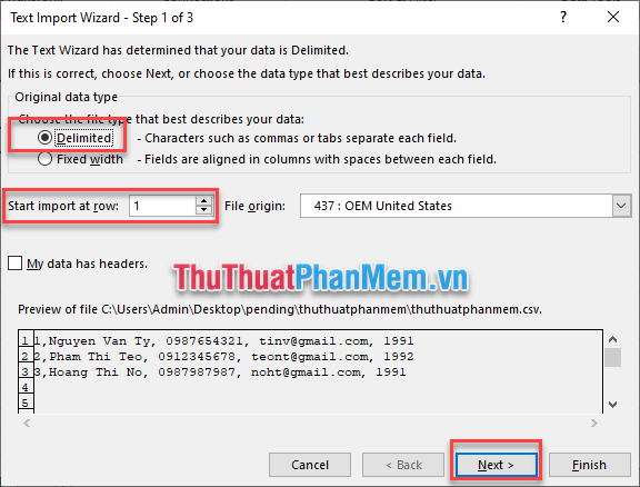 Step 5: Choose Delimiters (you can select multiple items) as the character to separate columns. For example, Ad chooses the comma to separate content by commas into individual cells. Check the data preview in the bottom window to ensure it meets your requirements, then press the Next button.