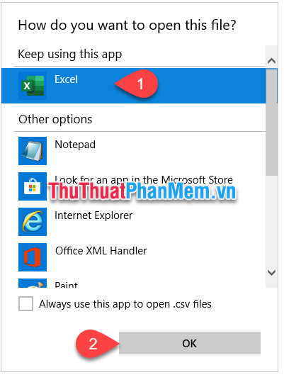 Step 2: The selection window appears, choose to open with Excel (1) => then press OK (2).