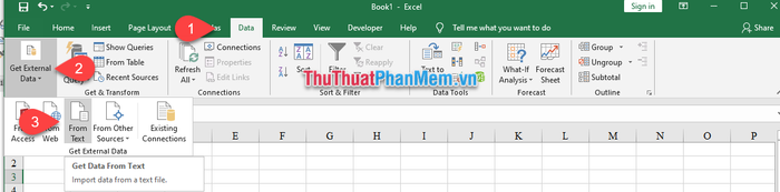 Step 2: Select the Data (1) tab -> choose Get External (2) -> then select From Text (3).