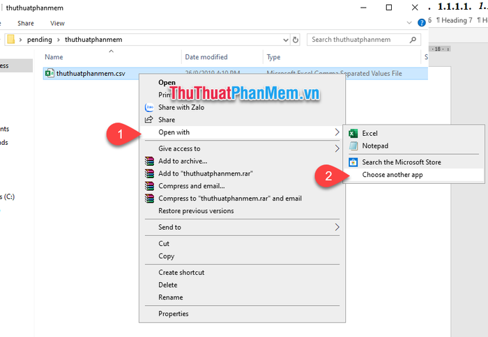 Step 1: In the directory where the CSV file is saved, right-click on it and select Open with (1), then choose Choose another app (2). If your computer already has Excel as an option like in the image below, simply select Excel.