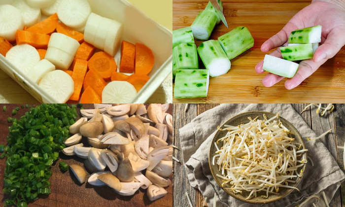 - Peel and wash the carrot, radish, and taro roots, then cut them into thick slices about 0.5cm thick.