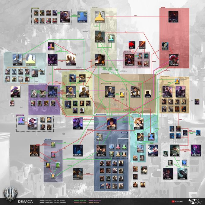 A comprehensive chart synthesizing connections among the most crucial champion group in the Demacia region.Upon careful observation, viewers will be surprised to learn that Xin Zhao was once abandoned by Katarina, Senna was chosen by Vayne, Fiora's lineage is merely a small branch compared to her peers, and Taric was expelled from the Aegis Protection. These details were not directly disclosed by Riot and have sparked considerable controversy. However, for the community of narrative enthusiasts, these are undeniably valuable pieces of knowledge.