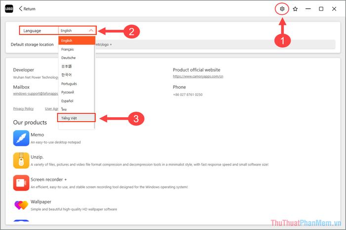 Choose Settings (1) and locate the Language (2) section to select Vietnamese (3).