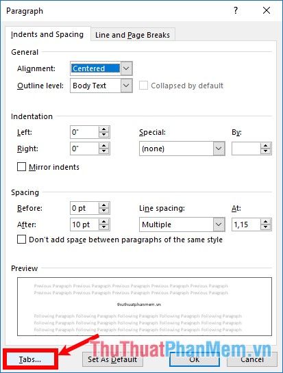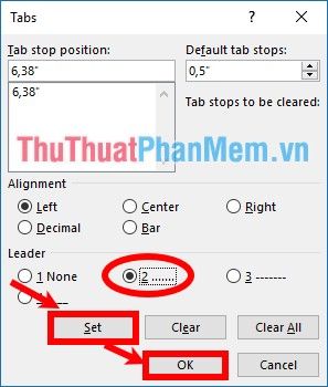 In the Tabs dialog box, choose the bullet style for the Tab in the Leader section, then select Set and OK to save the settings.