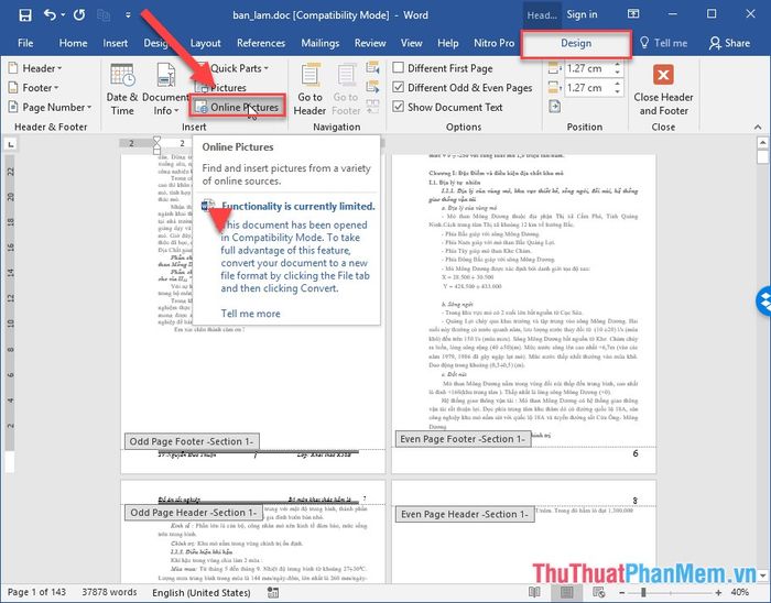 Additionally, you can utilize images to create page titles and footers by selecting Pictures or Online pictures in the Design tab: