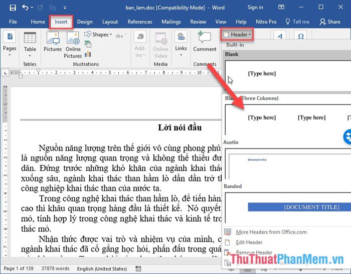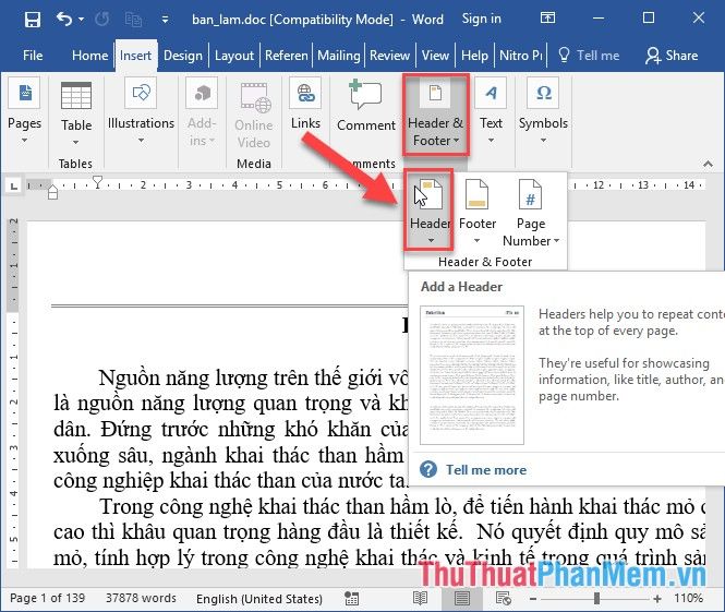 To create page titles and footers, go to the Insert tab -> Header (for page titles) or choose Footer (for footers):