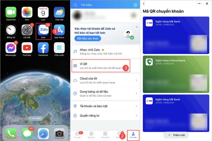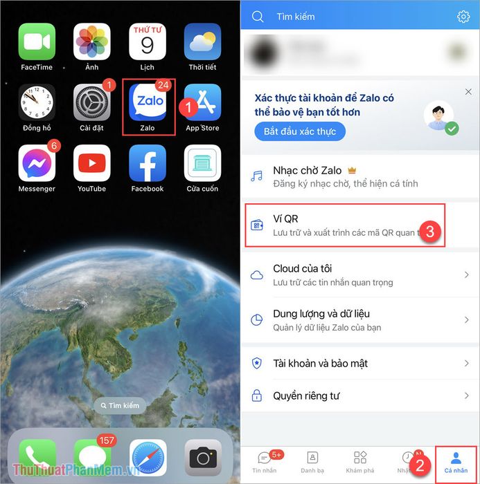 Step 1: Open the Zalo (1) app, go to Profile (2) and select QR Wallet (3) to access the QR code management wallet on your phone.
