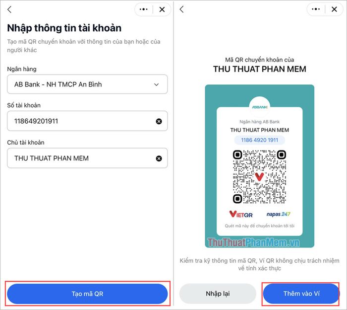 After completing the information, you select Create QR Code to confirm the code and choose Add to Wallet to store it on Zalo.