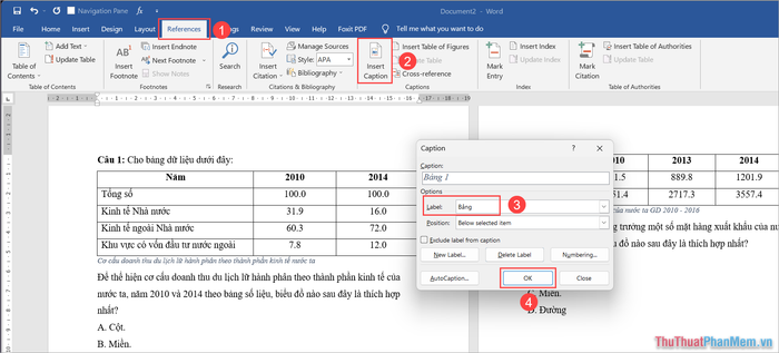 - Sequentially choose References (1) → Insert Caption (2) → Label (3) → OK (4).