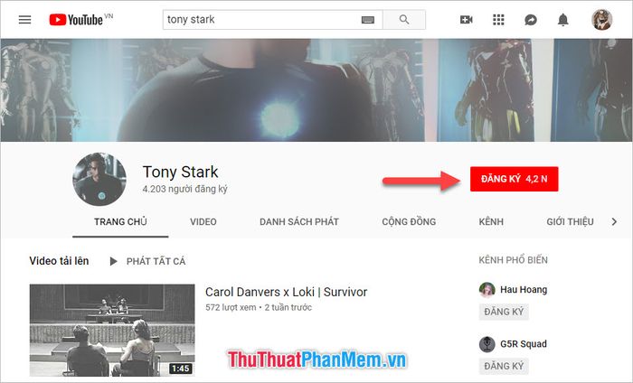 Once you're on the channel, you'll immediately notice the SUBSCRIBE button (or ĐĂNG KÝ in Vietnamese) prominently displayed in red next to the channel name. Clicking on it allows you to subscribe to the channel.