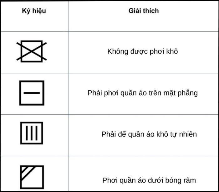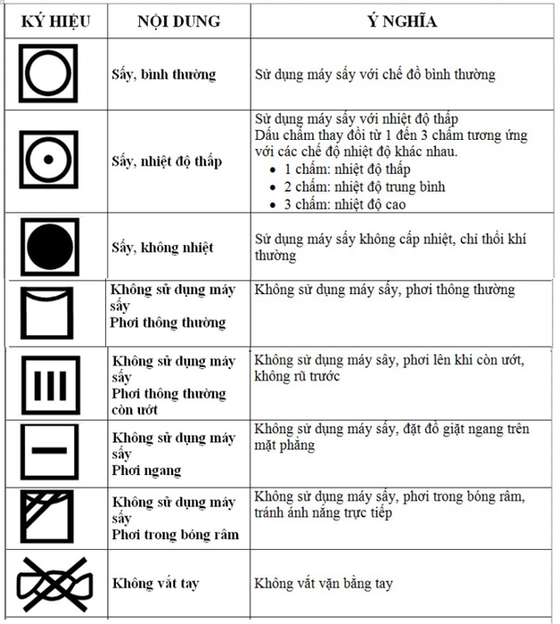 Symbols for pressing and drying clothes indicate which items can be pressed, should not be pressed, can be machine-dried, and the recommended drying temperatures. Here is a chart of common pressing and drying symbols: