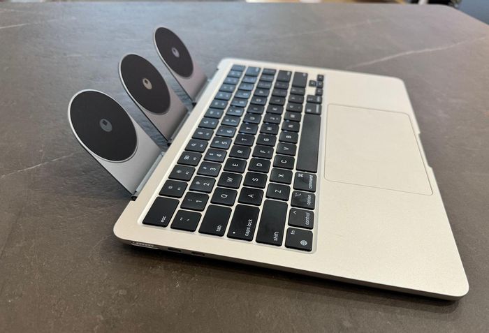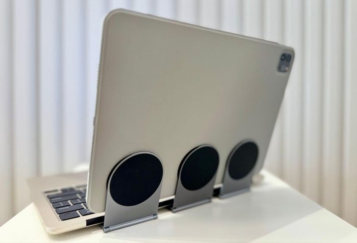 The user's initial concept was to create a floating computer with a personalized screen.Next, he attached three magnetic stands to the bottom of the MacBook Air, allowing the iPad to adjust to a wider viewing angle than the MacBook Air normally permits.