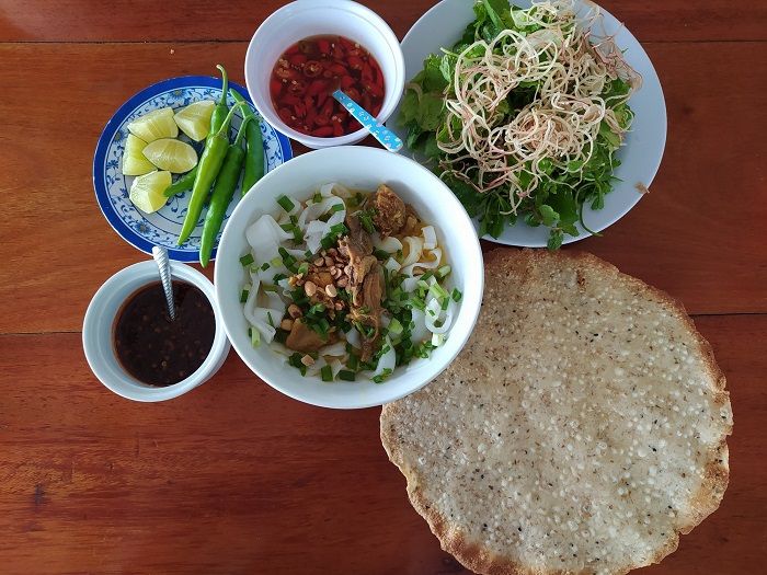 This is a specialty dish of Da Nang, where the seaweed is in long black strands, which expand when soaked in water and are also used for medicinal purposes.