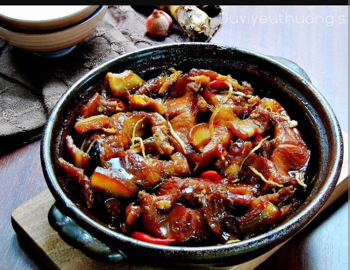 2. Use a clay pot for braising fish for best results. Arrange the fish in the pot, add fish sauce, stock powder, sugar, bean paste, pepper, chili, dark soy sauce. Pour water to cover the fish surface, braise until boiling. Add shallots to braise together, simmer over low heat until the sauce thickens, and the fish is tender.