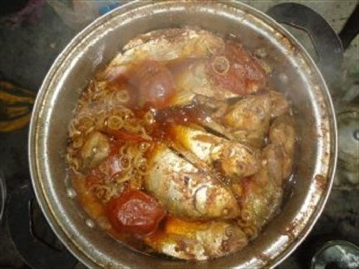 - Cho cá vào cho thêm ớt tươi, hành khô đun sôi cá trong 5 phút. Cho thêm gia vị vào cho vừa ăn rồi đun sôi cá cho đến khi gần cạn nước rồi mở vung khoảng 5 phút, sau đó đun lại cho cá săn thịt thì tắt bếp.