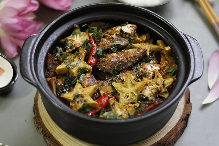 - Xếp riềng và sả vào đáy nồi, cho cá và thịt b chỉ vào, trên cùng bỏ khế vào.